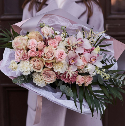 Букет из одиночных и кустовых роз, гвоздик, орхидей и маттиолы, с добавлением веток пальмы, экалипта и астильбы