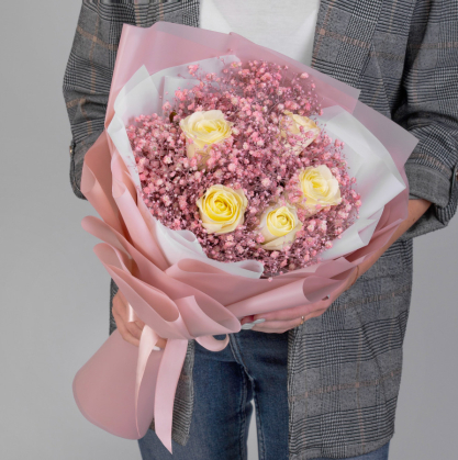Букет "Нежные объятия" с крашенной гипсофилой и розой в Мытищах