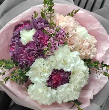 Ищете что-то особенное и нестандартное? Этот авторский букет ломает стереотипы. Флористы создали удивительную иллюзию — крупные, объемные соцветия, напоминающие гигантские ромашки, собраны из стойких и фактурных гвоздик. Игра контрастов — насыщенный фиолетовый, пастельный розовый и классический белый — притягивает взгляд. Россыпь нежного ваксфлауэра и веточки эвкалипта придают букету динамику и свежесть. Стильный подарок для тех, кто ценит креативный подход и современную флористику.