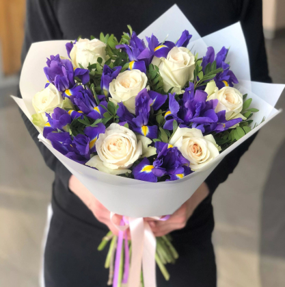Букет с ирисами и белыми розами | Купить в Мытищах