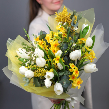 Удивительный и нежный букет из весенних цветов. В состав композиции входят: белые тюльпаны, веточки мимозы, нарциссы, ваксфлауэр, эвкалипт Бэби блу и упаковка.