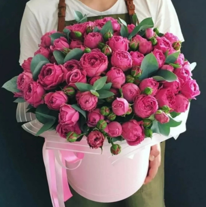 Потрясающая шляпная коробка с кустовыми пионовидными розами и эвкалиптом