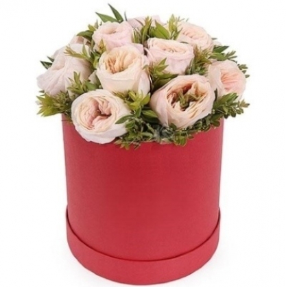 Яркая коробочка пионовидных роз с добавлением зелени
